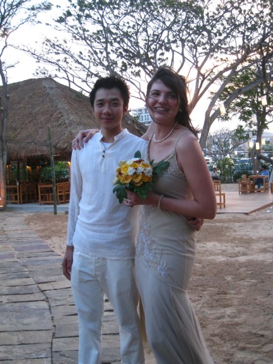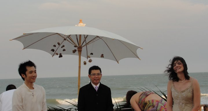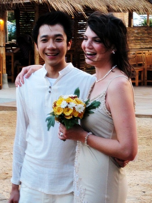 My friend Sarah, whom we took on a Snuggie Pub Crawl for her bachelorette party, recently had her destination wedding on a beachfront in Thailand (her hubs is of Thai descent). Doesn’t it look so simple and beautiful? And doesn’t she totally look like Jackie O. in that first picture?