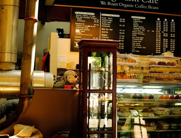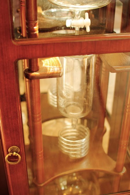 I ordered my usual Saturday morning indulgence: a nonfat, vanilla latte with Dutch coffee, instead of an espresso shot, and learned from the cafe owner that brewing the coffee in the Dutch brewer can take as long as 16 hours! The brewer (top and middle photos) is really impressive in person — it’s as tall as the pastry case and has spiraled glass parts. Don’t you love how it looks like it belongs in a mad scientist’s laboratory?