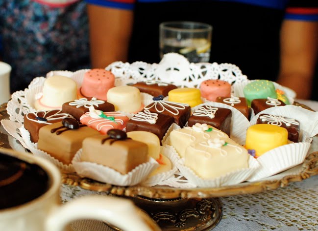 Petit fours, I learned, are small dessert cakes made of marzipan. Aren’t they pretty?