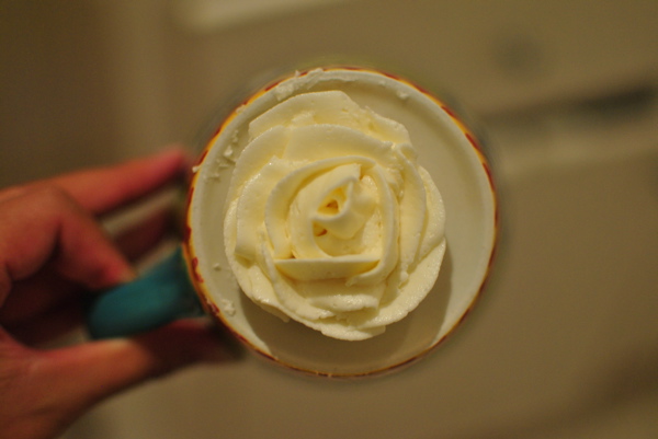 Still determined to bring pumpkin cupcakes with awe-inspiring roses to Thanksgiving, I couldn’t stop piping roses last night until they started to resemble (however loosely) real roses. This time, I tried buttercream frosting instead of the sumptuous cream cheese frosting I tried last time and found that buttercream is for sure much better at holding its stiffness. For a long time the roses I piped looked like blobby, mushy flowers which Alan assured me looked good, but I refused to stop. Finally, after a good few hours, they started to look better. I know they’re nowhere near as good as some other buttercream roses out there, but I hope these will knock a sock or two off at the Thanksgiving table this year.