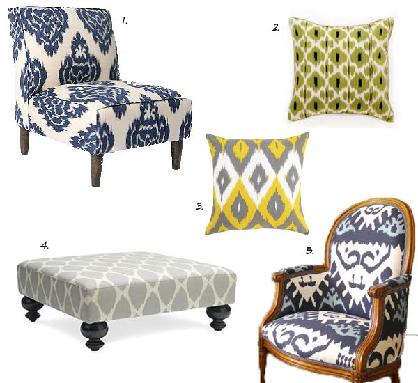 Lately I’ve been obsessed with decorating ideas for our new place. It’s the first apartment I’ve lived in where I feel really comfortable and where I actually find myself spending time thinking about what will fill the walls and what color living room I’d like to eat my toast in on Saturday mornings. Right now I’m in love with ikat textiles on just about anything — chairs, pillows, ottomans. I’d especially love having curtains in the blue and white pattern from the chair in the top left corner. Since there’s so much brown in our living room, I think it’d make for a really nice contrast.