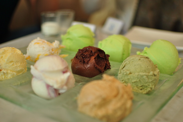 the sampler: three scoops of lamut-flavored ice cream for the locals (sweet steamed vegetable is the best I can describe it), blueberry cheesecake, green tea, chocolate, coconut-jackfruit, durian, and one that tasted like Baileys