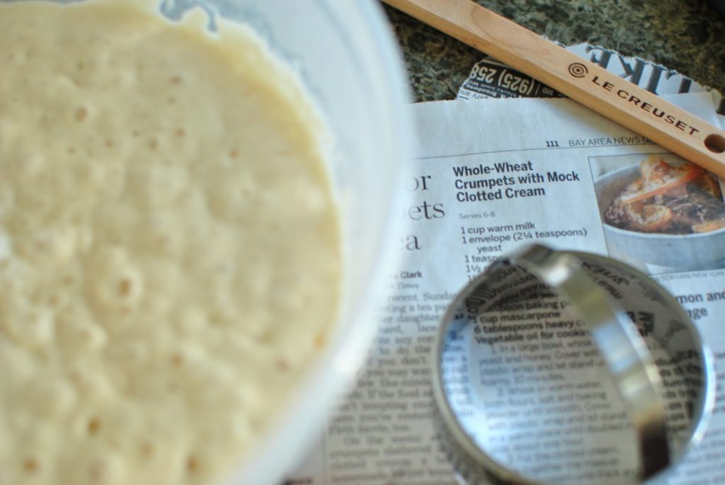 The other day, I had breakfast with my friend Preethi, and I was blown away when she told me that she wears running tights underneath her work pants in order not to freeze to death on her way into work (she lives in D.C.). I was also shocked today to see a Facebook picture of Petrie playing in actual snow in my parents’ backyard in Oregon. These are places that, I know, get really, really cold. And still, somehow, whenever the temperature dips to 50 or below here in California, I can barely stand it. This past Saturday was one of those days, so I stayed in and mixed up a thick, sticky batter for a large batch of crumpets. I had found the recipe in the paper the day before, and it seemed like just the thing to smother in butter and jam and pair with a mug of hot coffee.