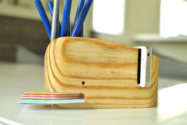 Since both Alan’s desk and mine are in the living room, I like to try and keep our work surfaces tidy. (Try being the operative word, ha ha.) Alan is super particular about his writing instruments (his pen choice of the moment are these Eberhard Faber fine point felt tip pens, in case you were wondering 🙂 but loses them all the time, so he has lots and lots of them piled all over his desk. Our little office area was starting to look like Staples, so I decided a desk organizer was in order. After searching for something simple and modern, it was a toss up between this modular one and this wooden whale. In the end I went with the whale because he’s cute and because he holds…